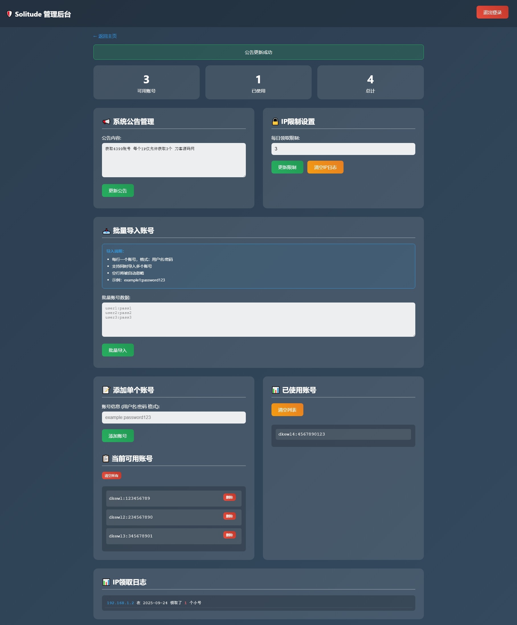 小号分发 卡密分发系统网站源码 轻量化小编2个月前更新关注私信0185917 简介: 小号分发 卡密分发系统网站源码 轻量化 此为小号分发卡密系统源码,专用于分发小号库存账号或卡密等使用,不过规定每个IP仅能领取3次,也可视作小号分发工具。 已做过简易测试,感兴趣者可自行部署使用! 图片: 小号分发 卡密分发系统网站源码 轻量化此内容为付费资源,请付费后查看¥0.88超级会员免费立即购买建议开通会员可以无限制的免费下载付费资源© 版权声明文章版权归作者所有,未经允许请勿转载。THE END网站源码 喜欢就支持一下吧点赞17赞赏 分享QQ空间微博QQ好友海报分享复制链接收藏